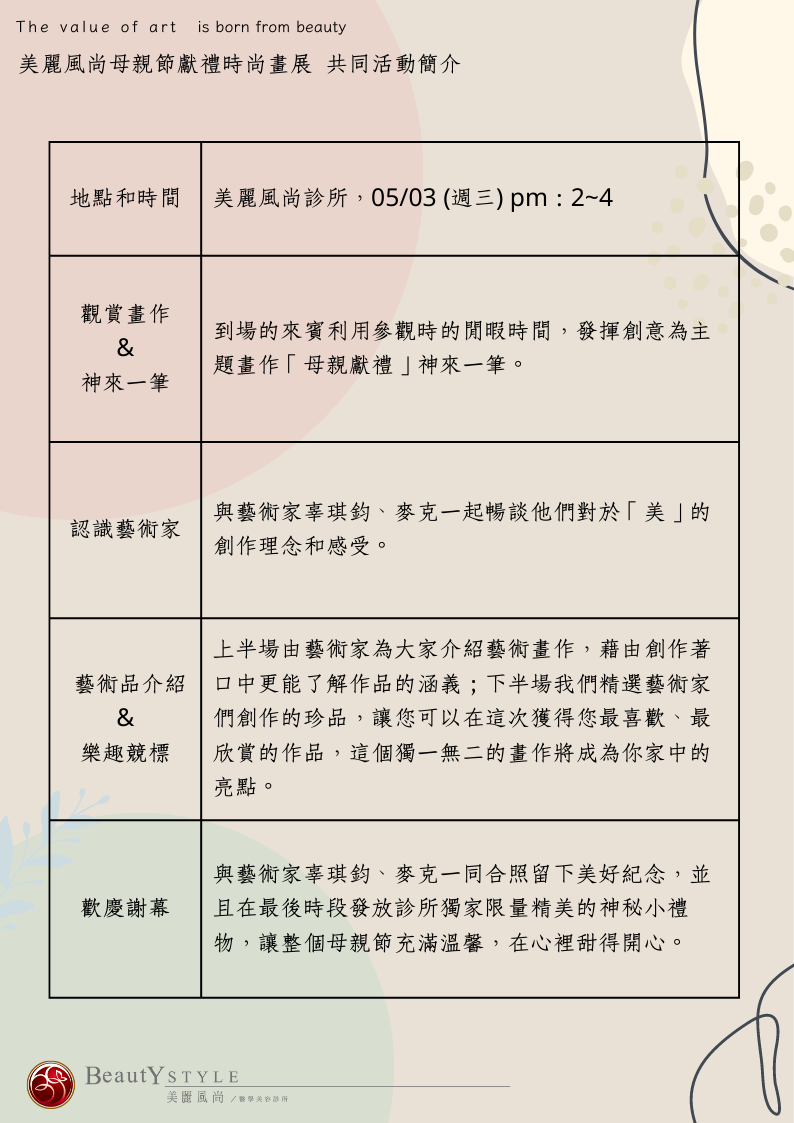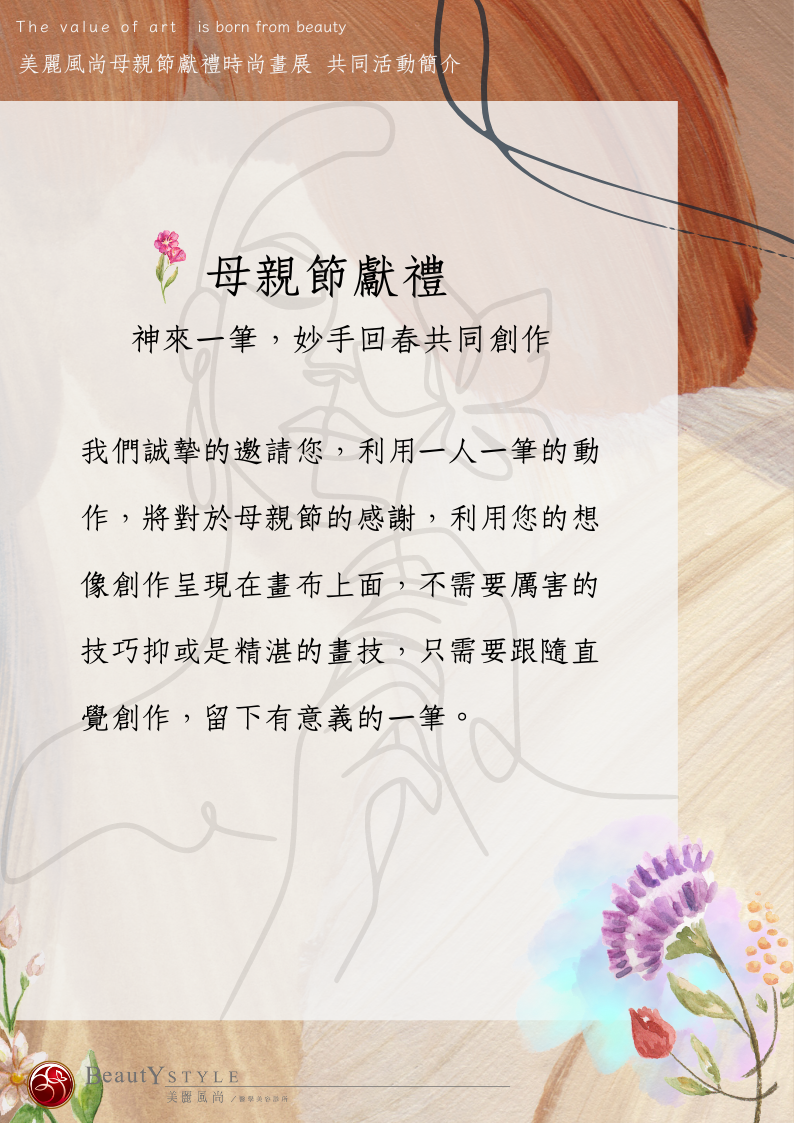 #醫美 #藝文評論 藝術家與醫美的聯名盛會,母親節獻禮,共同為心中偉大的母親畫出神來一筆! Apr 18. 2023 一起與藝術家體現美的最高境界,當天不只提供藝術展覽、藝術拍賣,最重要的是您對母親的感謝,留下有意義的一筆。